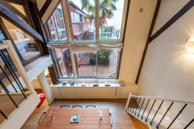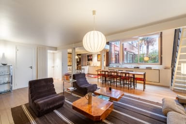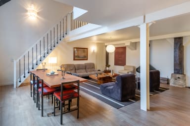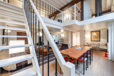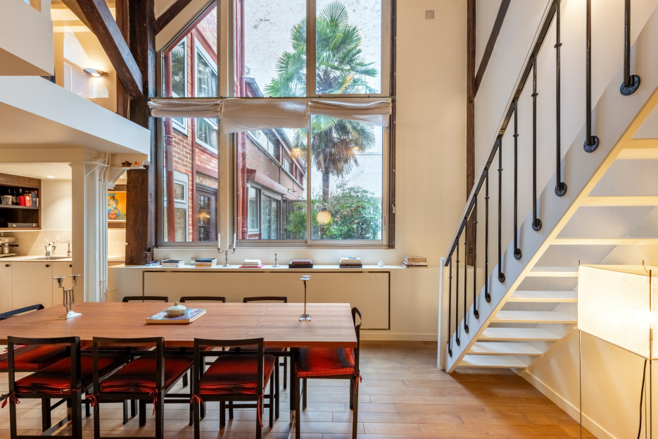 This atypical loft-style duplex blends the retro charm of the 1970s with a minimalist contemporary aesthetic, creating a space that is warm, bright, and highly functional.